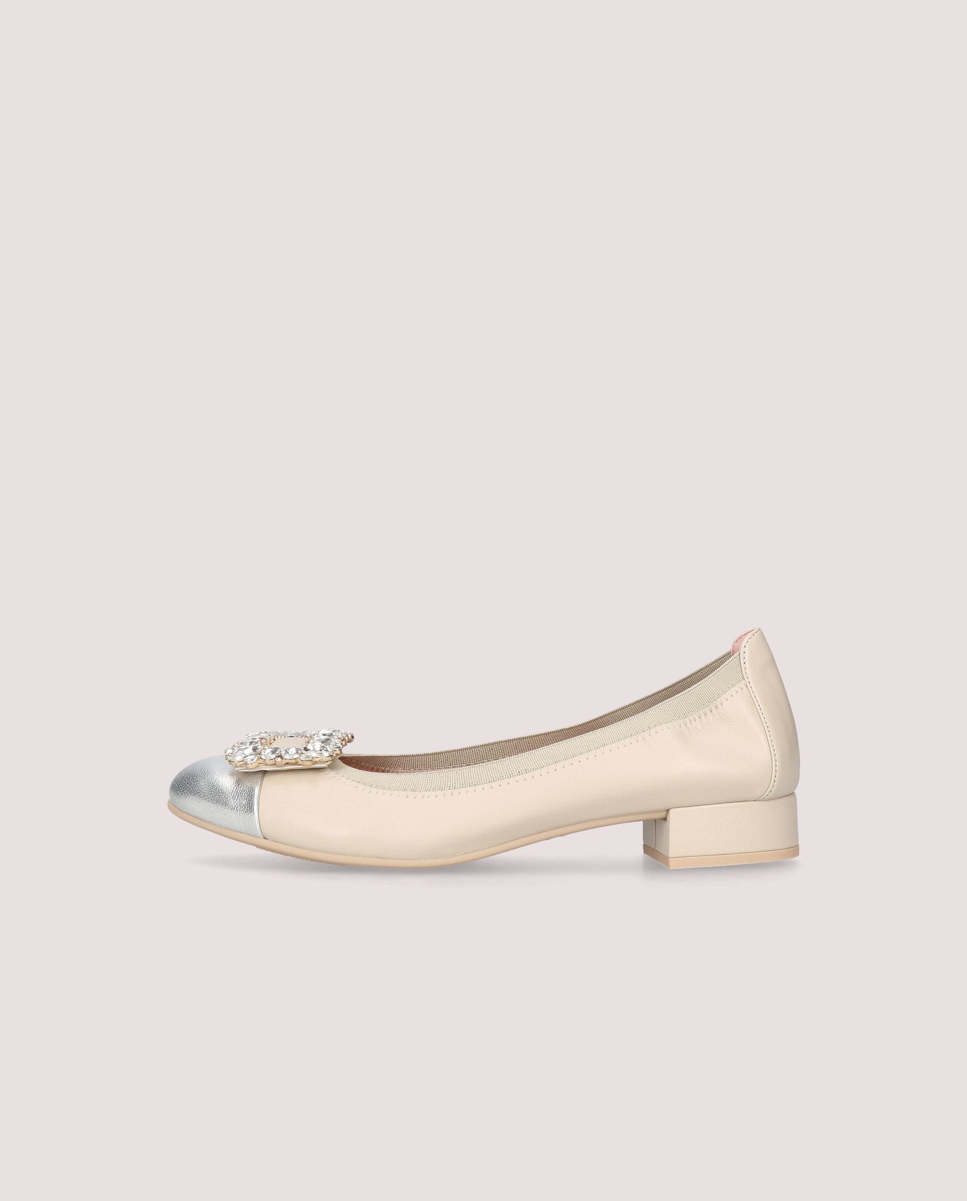 NICOLE CREAM LEATHER SILVER CAP TOE CRYSTAL BUCKLE LOW HEEL BALLET FLAT